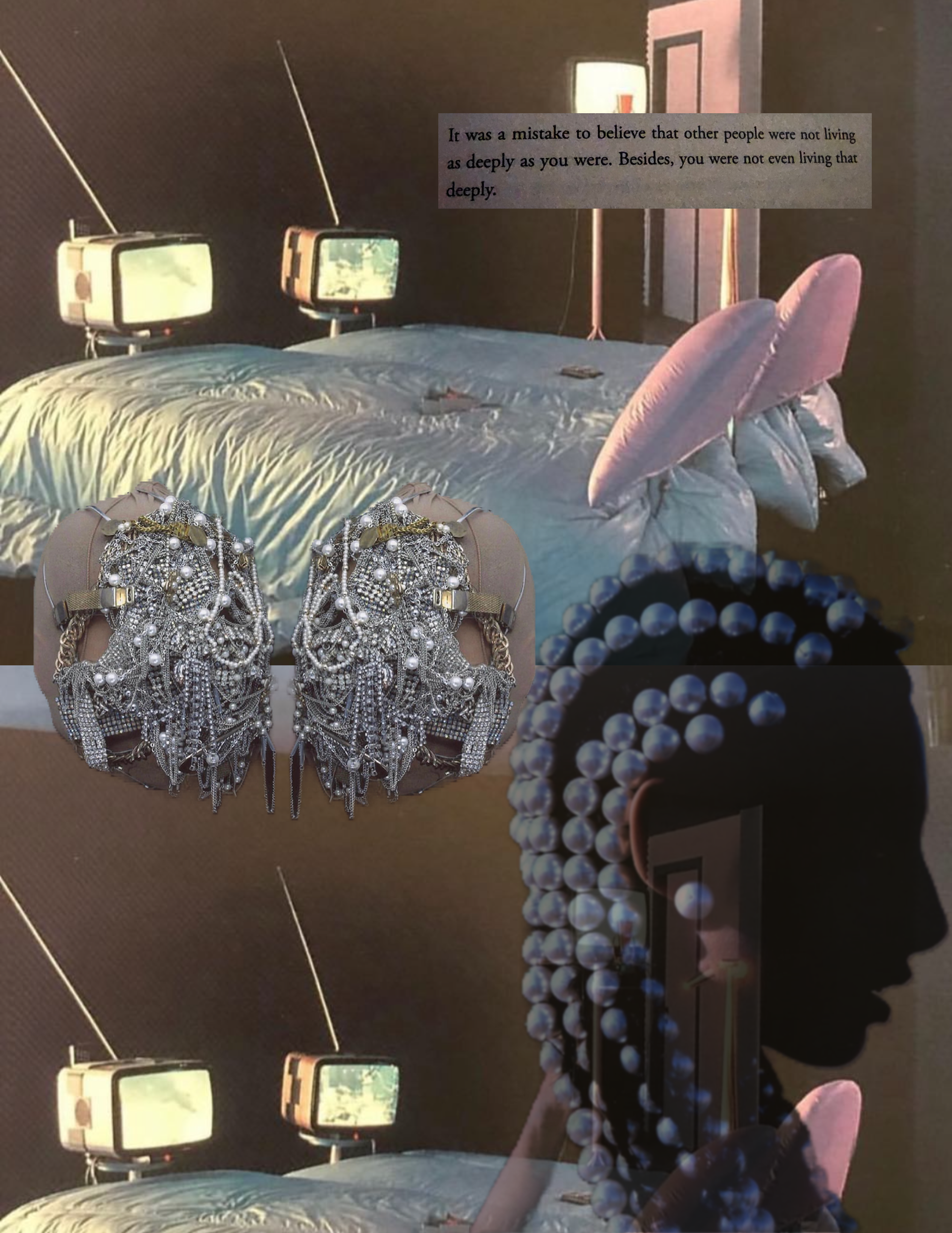 A collage about visibility fatigue. I think people are often times more concerned with looking like they’re operating with a high degree of depth, rather than just meeting themselves deeply. But I also think that I used to suffer from a touch of that. I was deeply concerned with never seeming like I wanted to hurt anyone. Such a strange fixation looking back on it now. It wasn’t enough to just know in my heart that I never had an ill- will, but I had to make sure other people understood it too. But I think assuming people think and operate the way you do is a safety hazard. It’s also none of our business honestly. It’s also centering your ego in all the most dangerous ways, completely self- inflicted. Proving that even though I wanted to seem well- intentioned, I wasn’t. Because If I was willing to hurt myself, it seems I wanted to hurt at least one person.