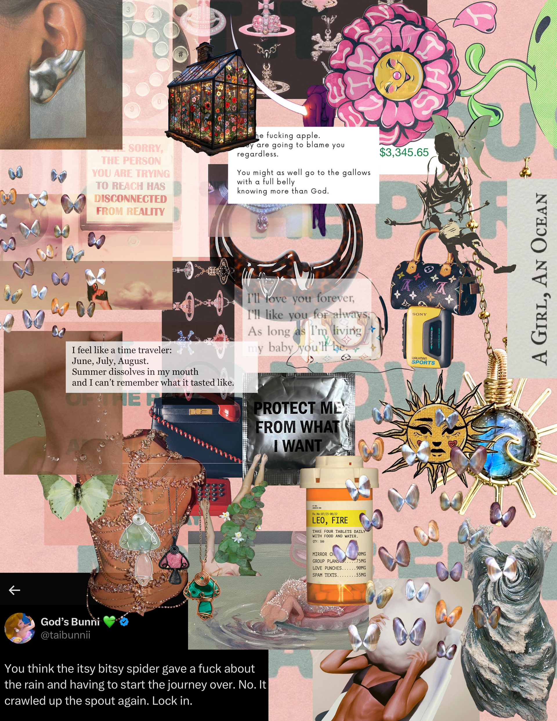 A collage about the unrelenting speed of time. People say I have time. To decide, to change, to want a different life, and to pursue it. But time doesn’t feel slow — it rushes by, and quietly. Most of my peers at this point are either married, have kids, or both. I know exactly what my path is not, but I haven't the foggiest of clues of what it actually is. Some days I feel free but other days, I feel left behind. I thought I’d feel young longer. I don’t feel young, but I feel youthful. I don’t feel old, but I feel wiser.