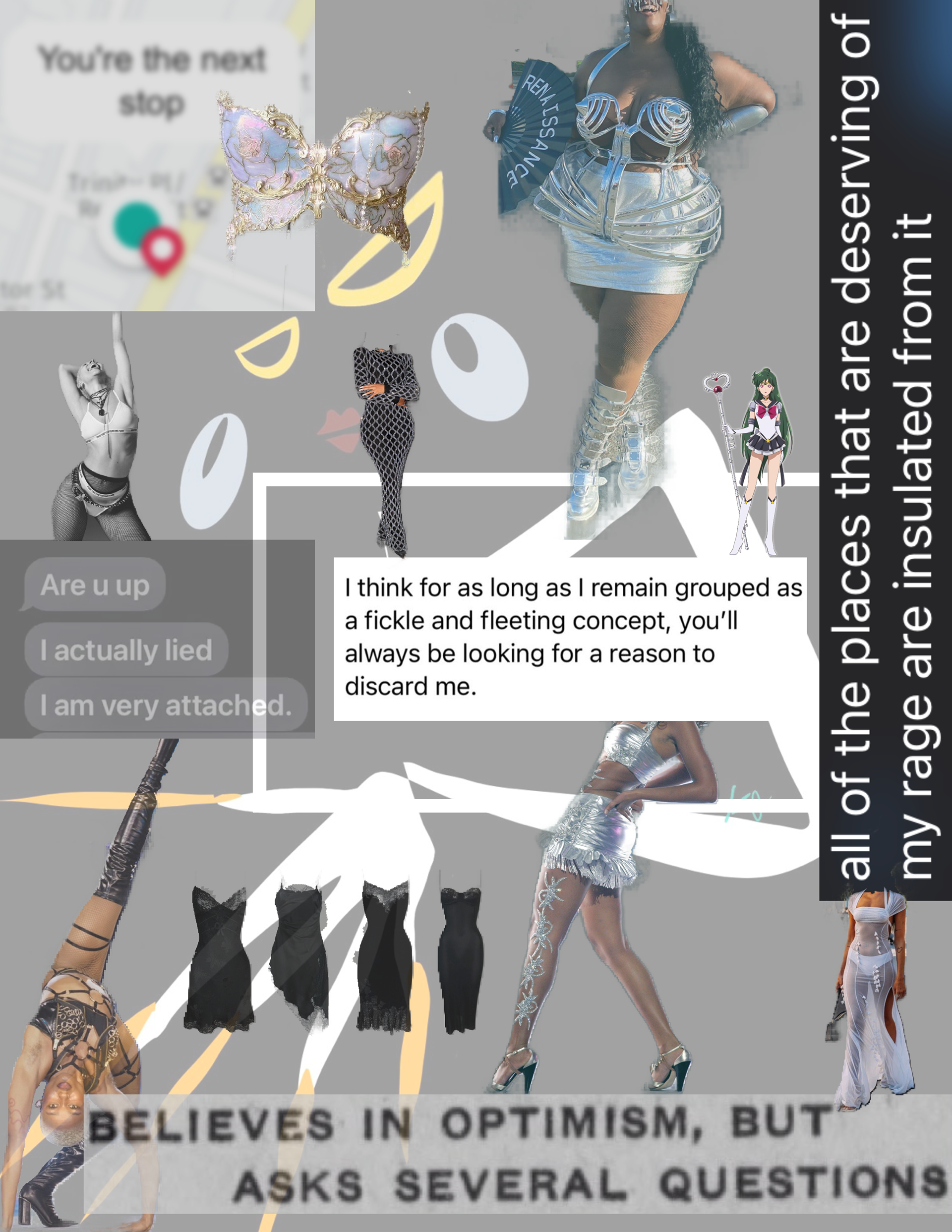 A collage about skepticality in love. When I finished this piece, I was leaving a romantically ambiguous situation. He inadvertently dragged me into his reality, not expecting me to have the one psychological motivation that could disarm him. Love, and one that wanted nothing from him- other than reciprocity. That situation left me a bit skeptical, but hopeful for something real. As I write this piece description two years later, I have just left another romantic situation. Less ambiguous, no less nuanced. He also dragged me into his reality, and said aforementioned psychological motivation couldn’t save either of us. Since I also dragged him into my reality once he dragged me into his. So, I'm still feeling quite skeptical.